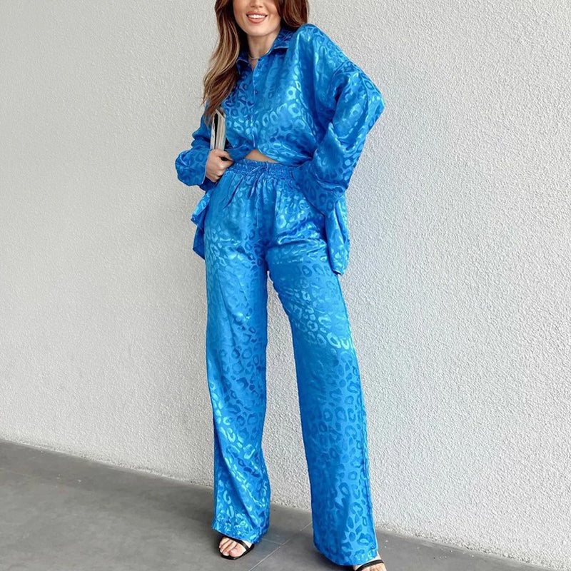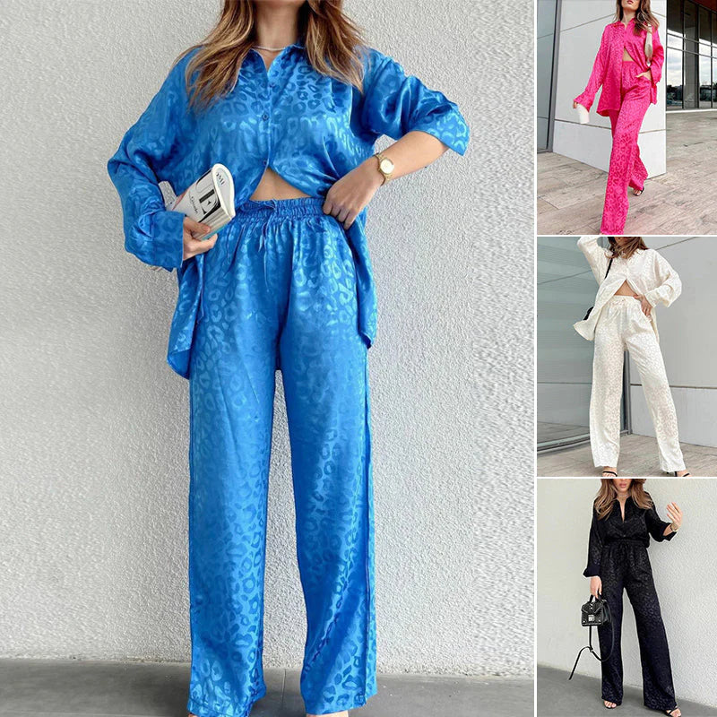 Make a bold fashion statement with the women's two-piece leopard print set. This stylish set combines comfort and trendiness, perfect for those who want to stand out from the crowd. The set includes a button-up, collared top and drawstring pants, both featuring a striking leopard print. The loose fit offers a relaxed and effortless look, while the high-quality fabric ensures comfort and durability. The button-up top with a collar adds a touch of sophistication, while the drawstring pants provide versatility and adjustable fit. Whether you're heading to a party, a casual outing, or just lounging at home, this two-piece set is a must-have addition to your wardrobe.